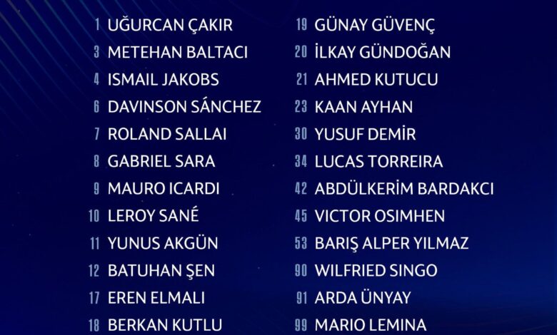Defans: Metehan Baltacı, Davinson Sanchez, Ismail Jakobs, Eren Elmalı, Abdülkerim Bardakcı, Wilfried Singo, Kaan Ayhan, Arda Ünyay